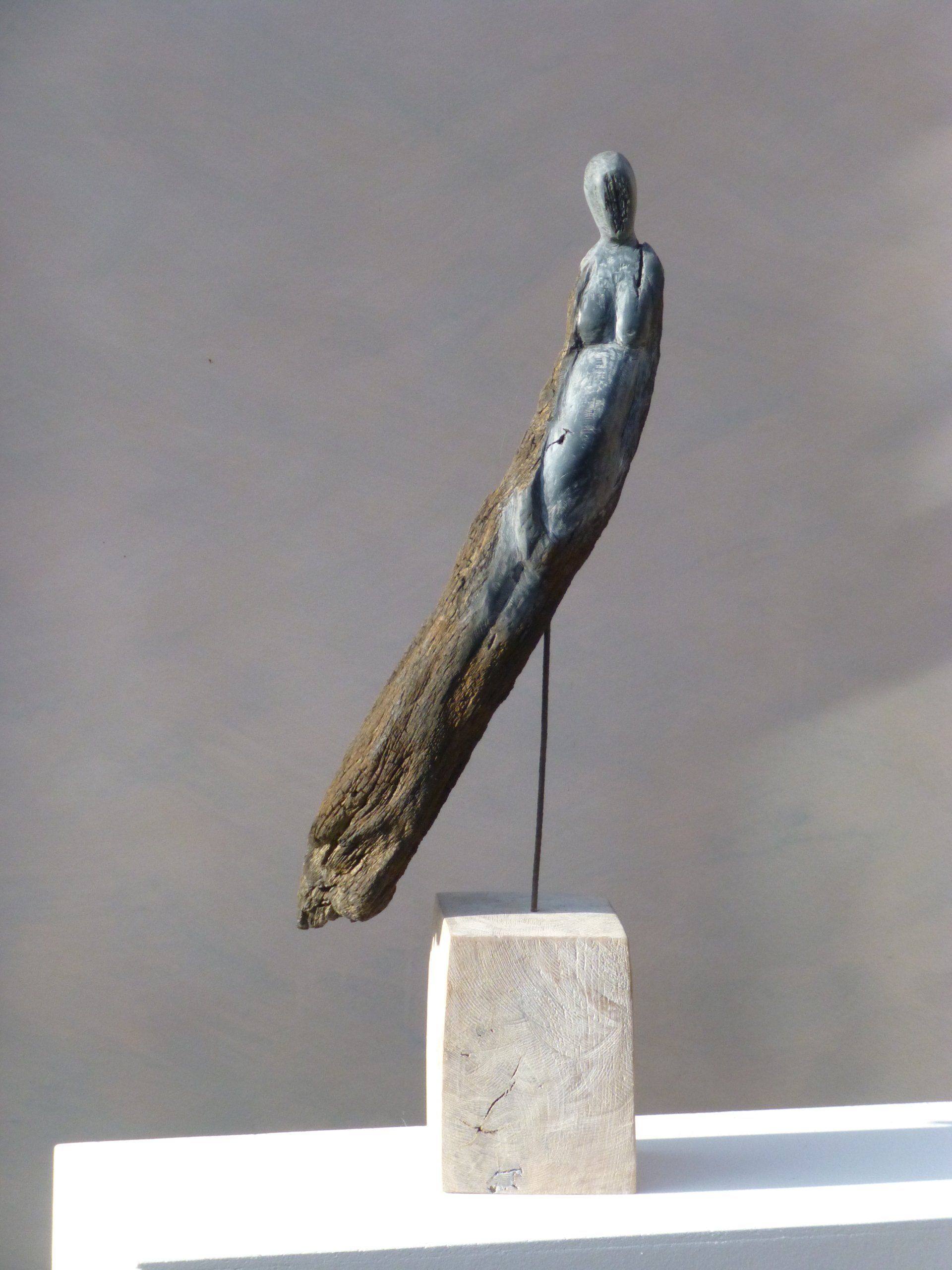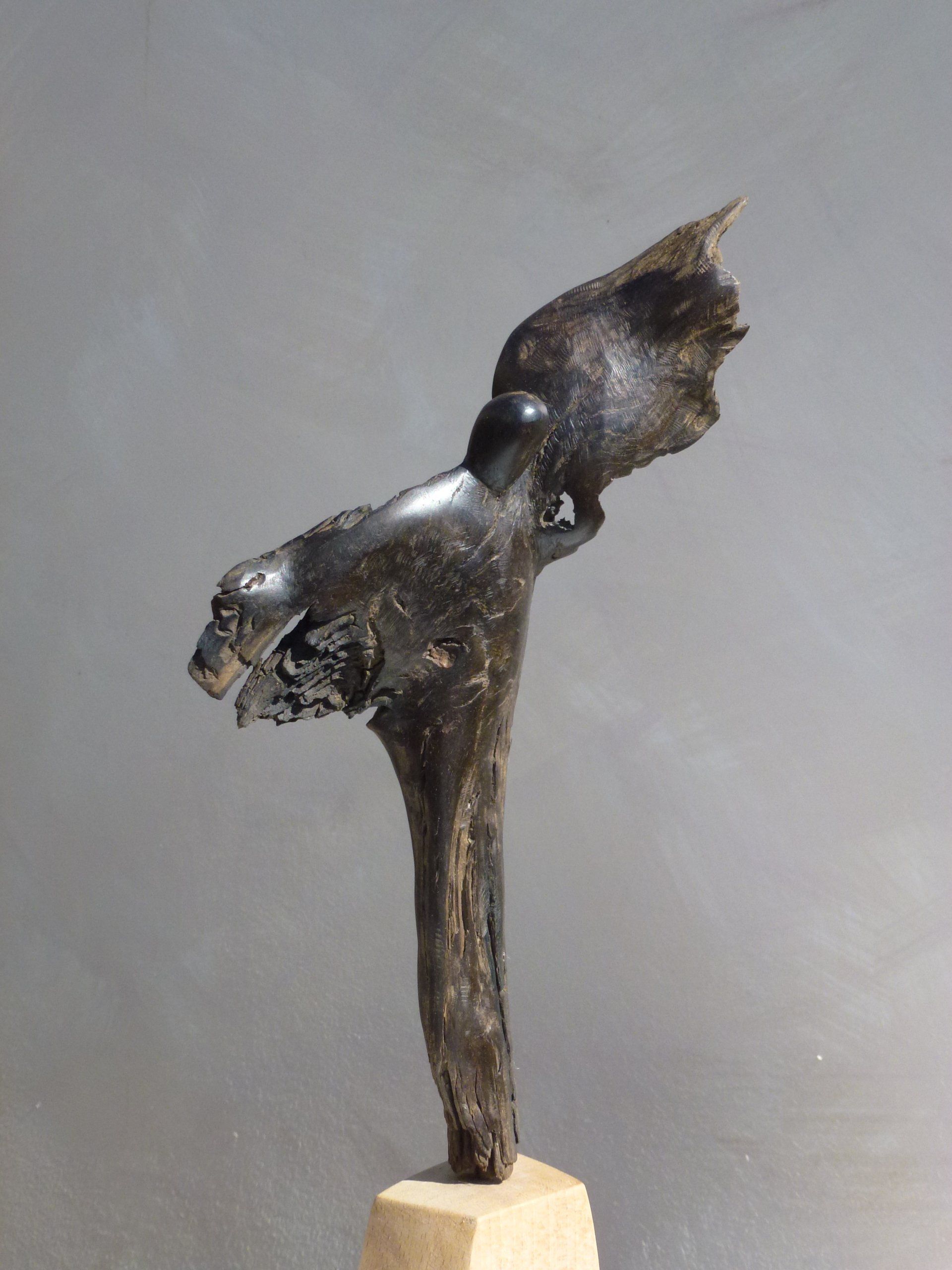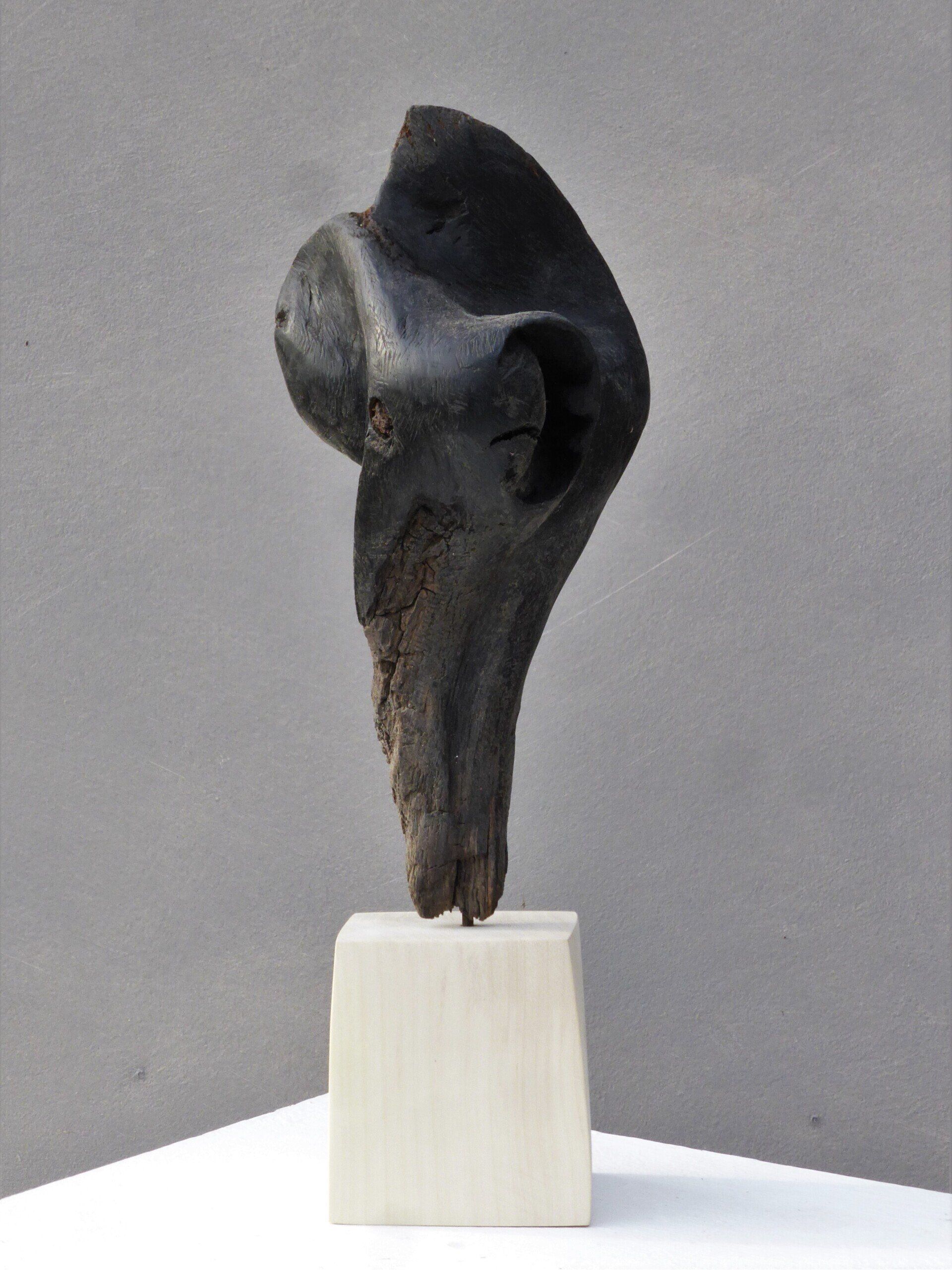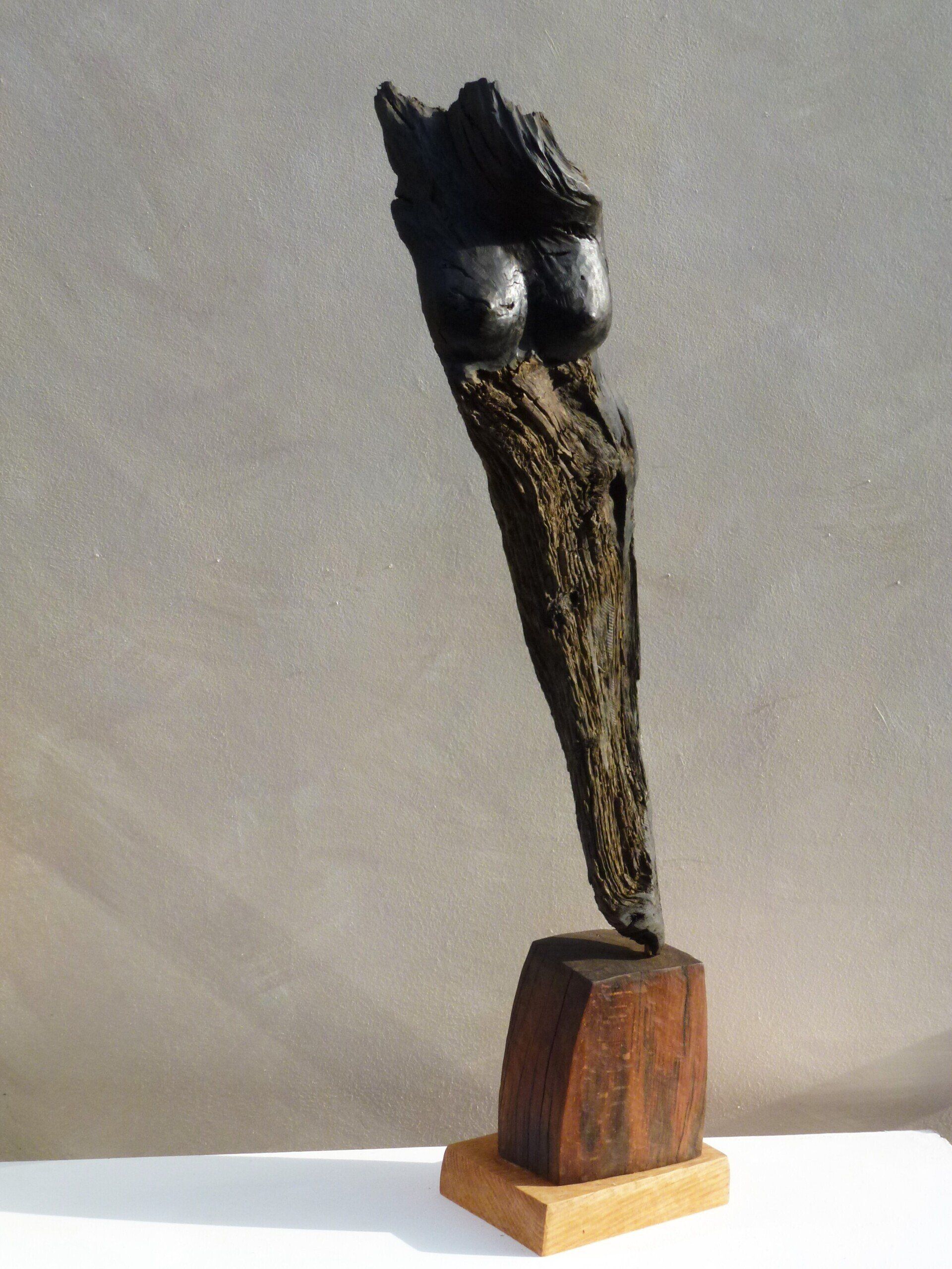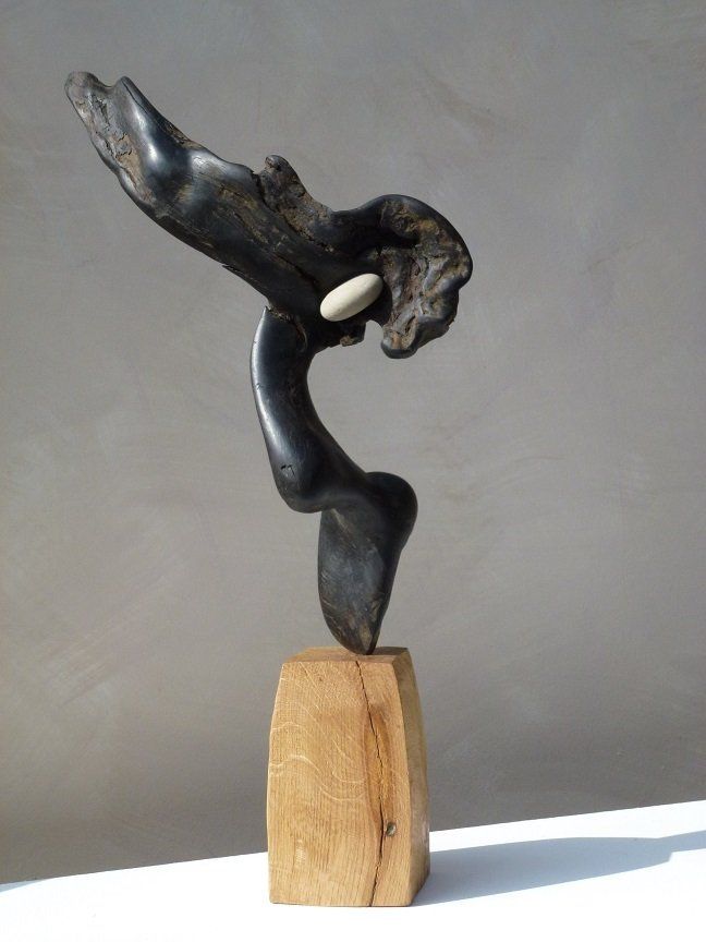 Das Ausgangsmaterial meiner Holzskulpturen ist vielfältiges Fundholz aus Raum und Zeit, wie mediterrane Pinien- und Olivenwurzeln, alte, schwarz gewordene Flusseiche aus der Elbe oder sogar 2000-jährige Mooreiche aus Ostfriesland.