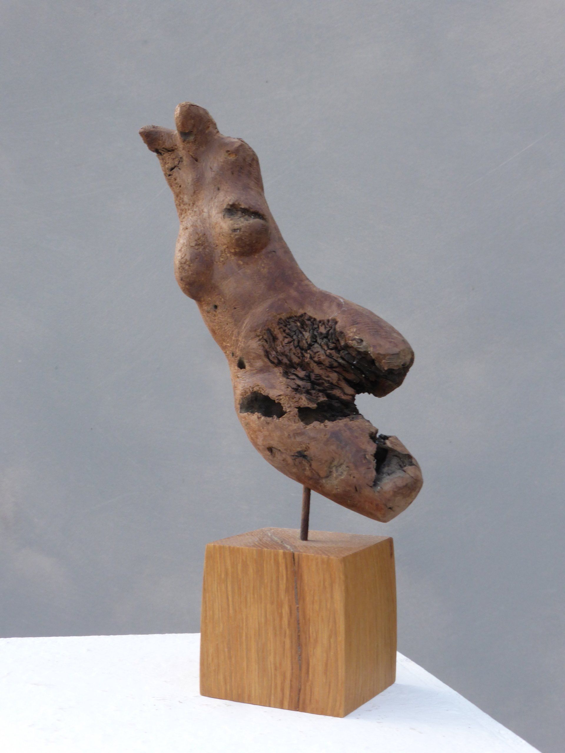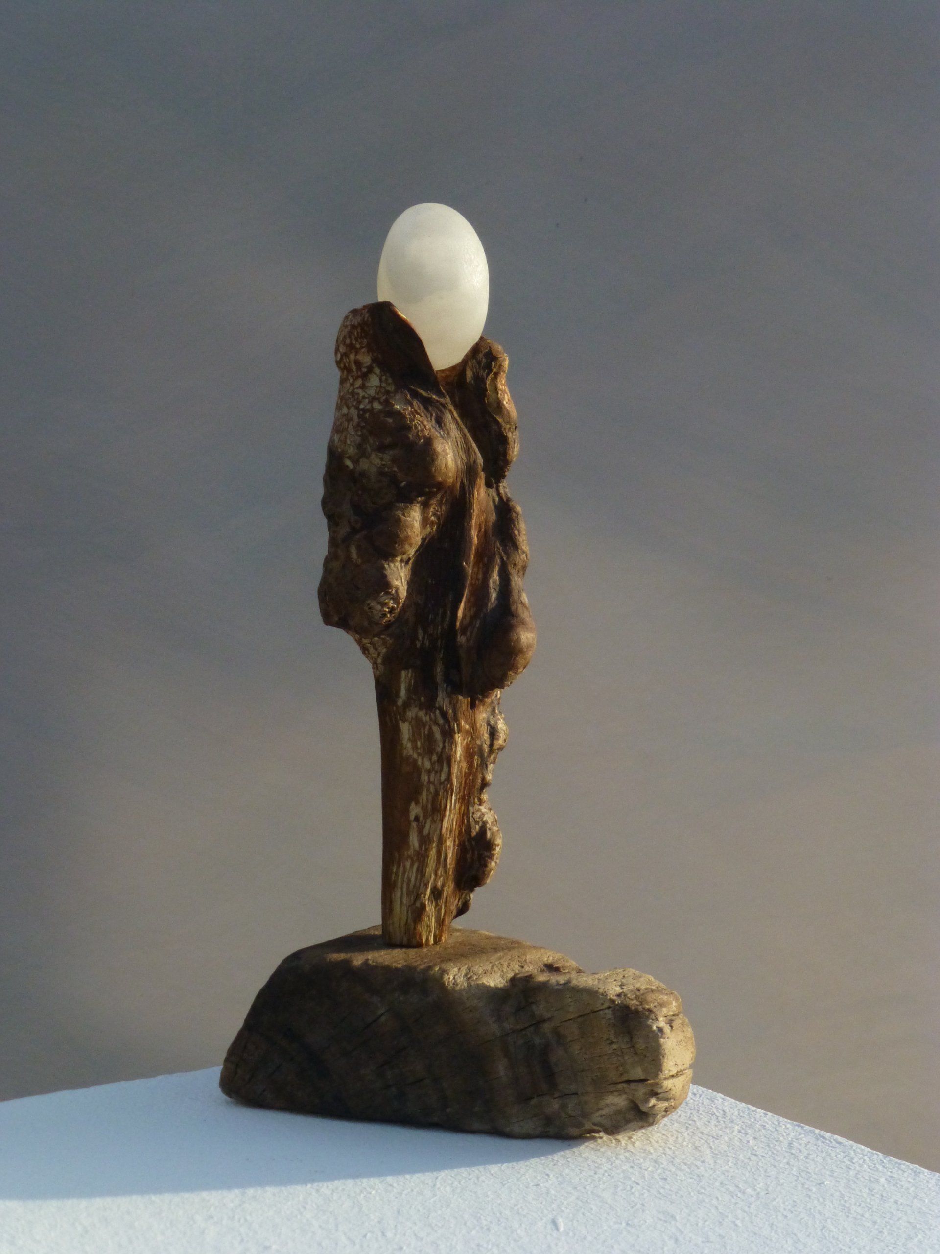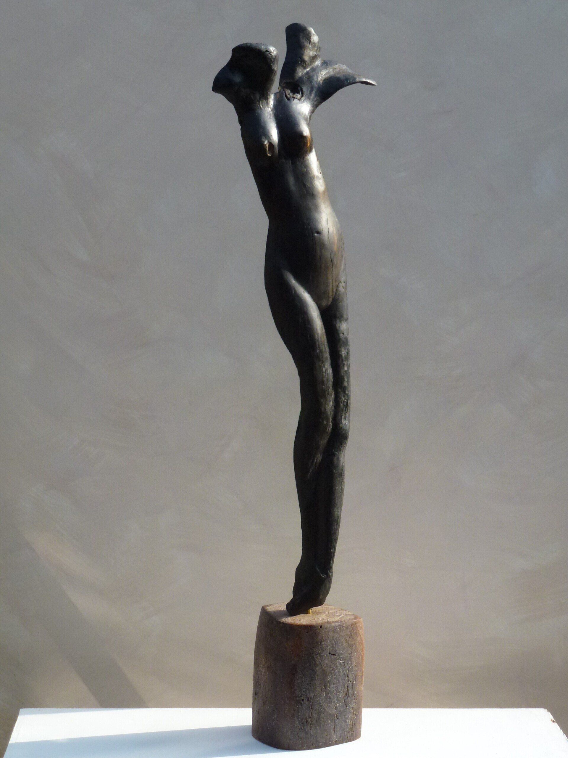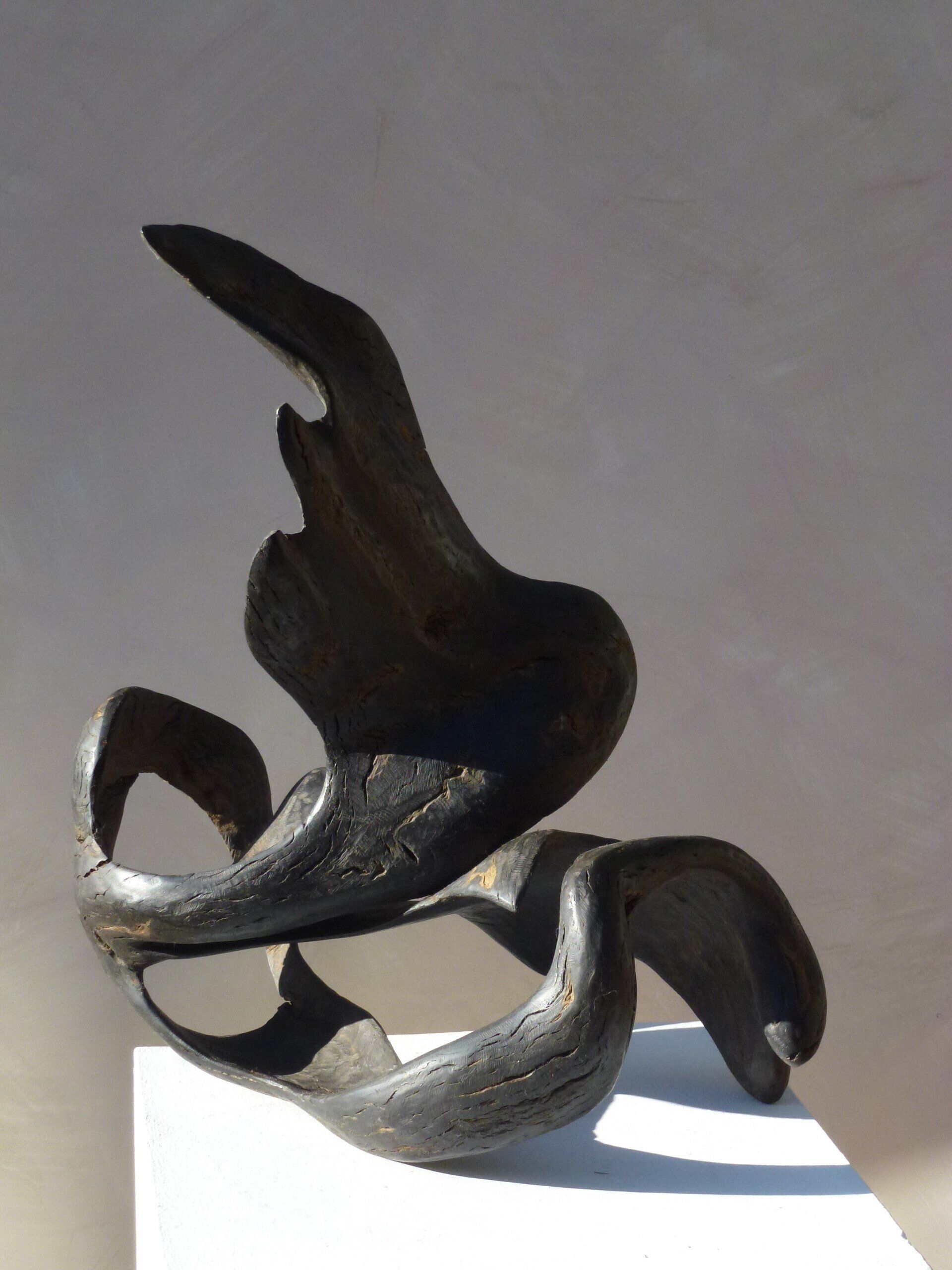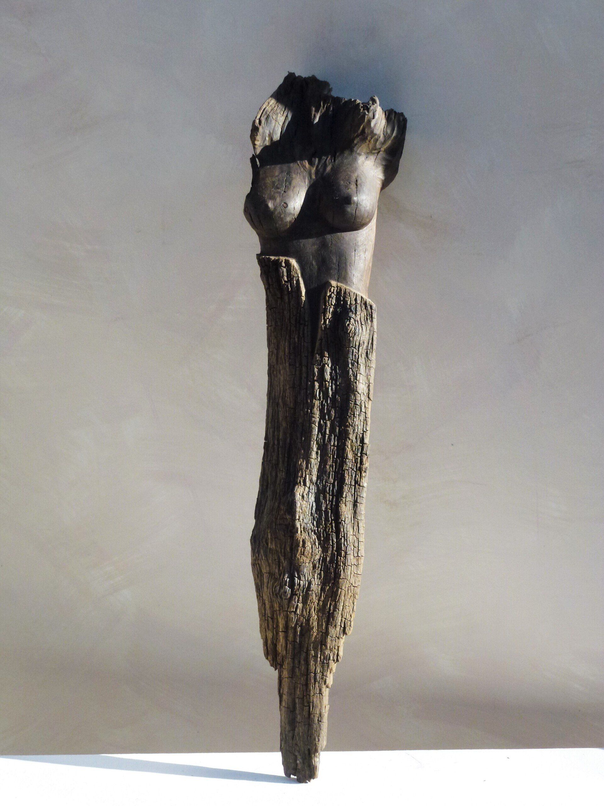 Das Ausgangsmaterial meiner Holzskulpturen ist vielfältiges Fundholz aus Raum und Zeit, wie mediterrane Pinien- und Olivenwurzeln, alte, schwarz gewordene Flusseiche aus der Elbe oder sogar 2000-jährige Mooreiche aus Ostfriesland.