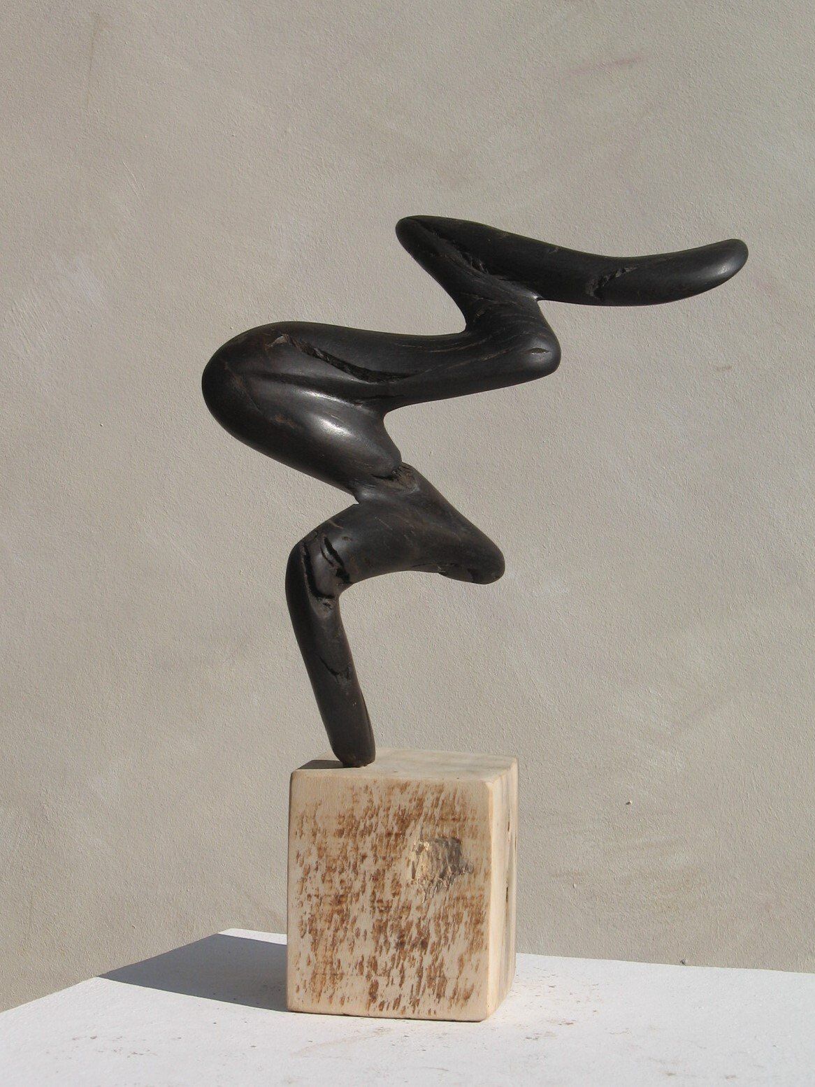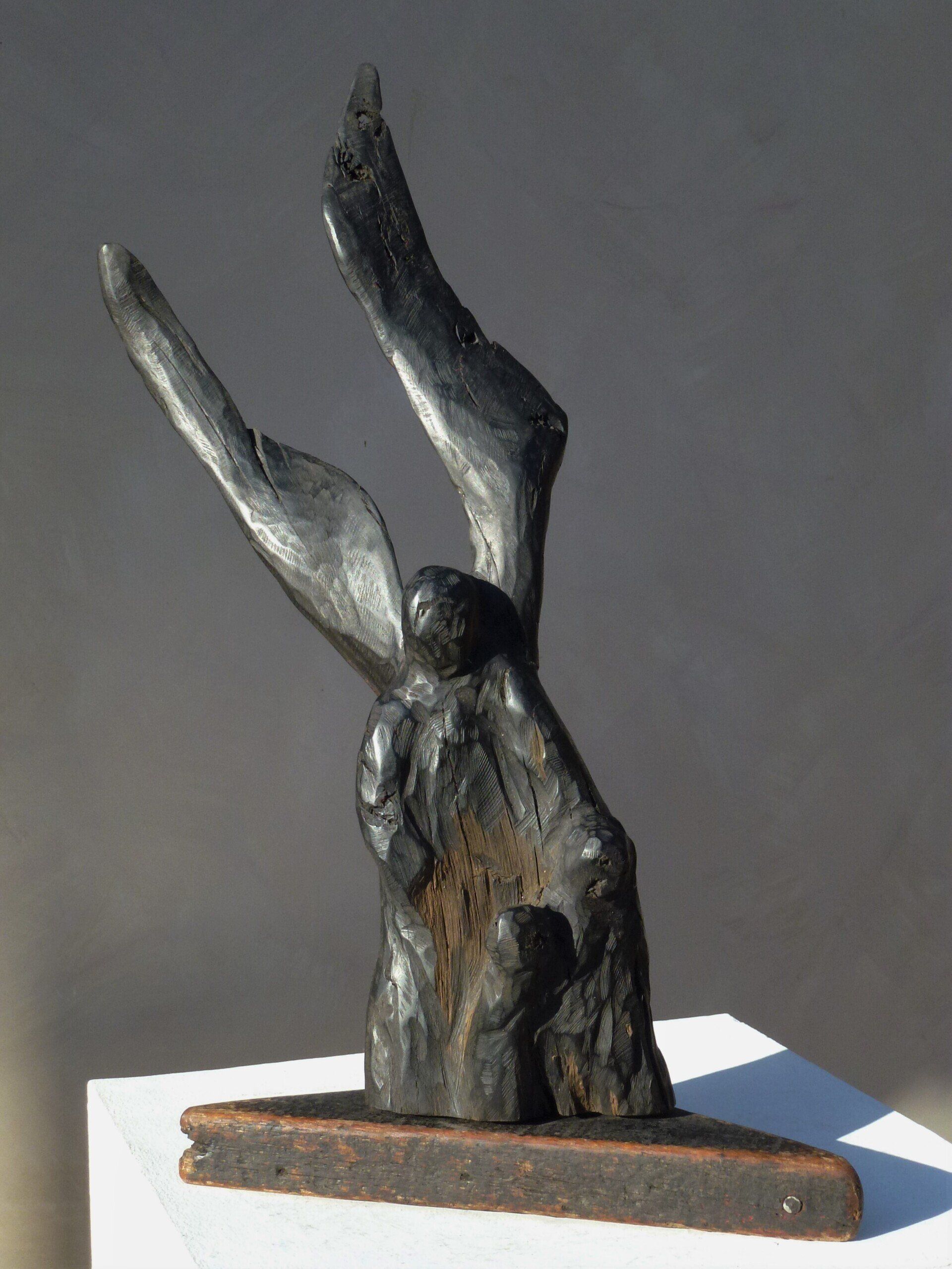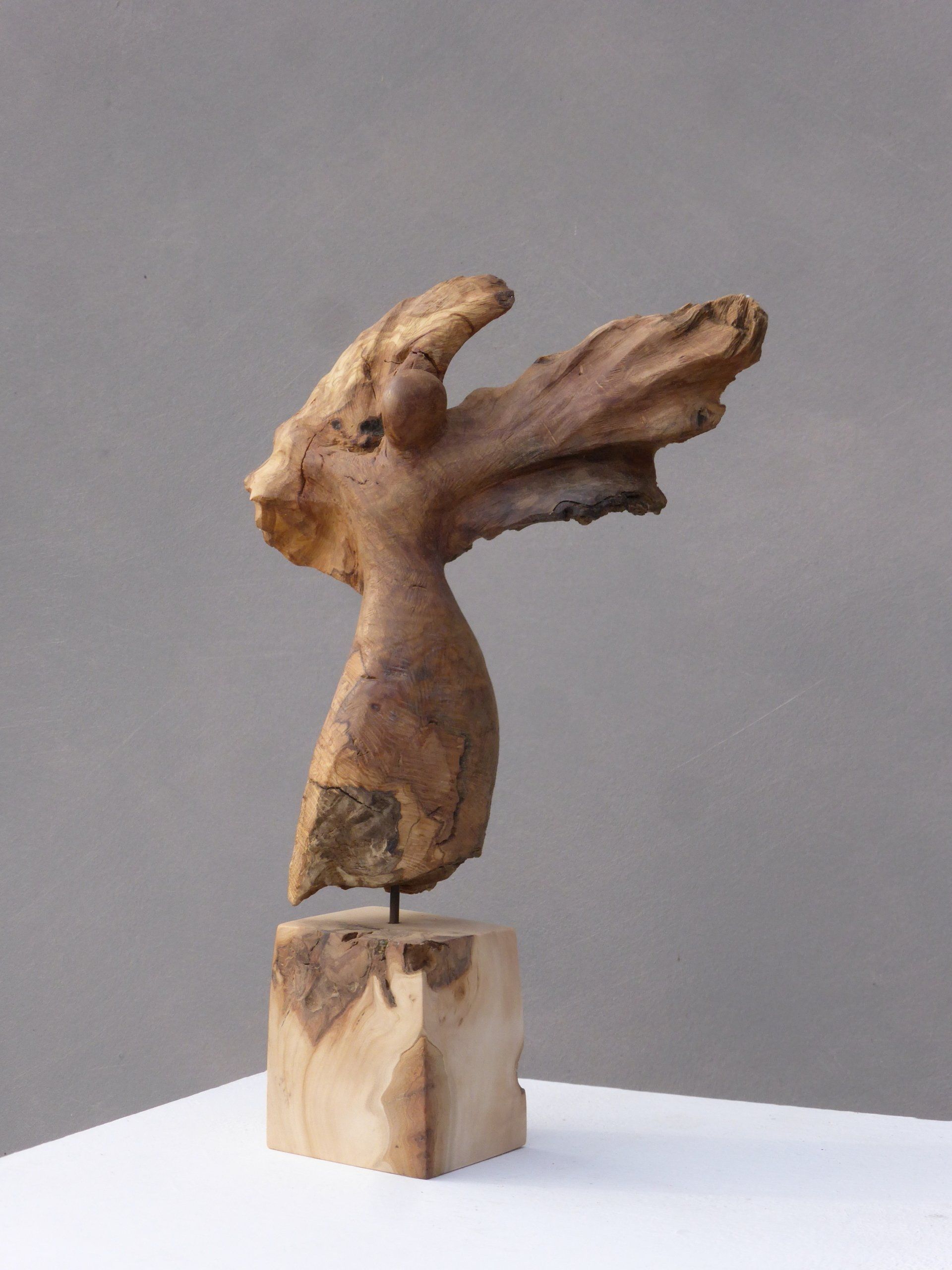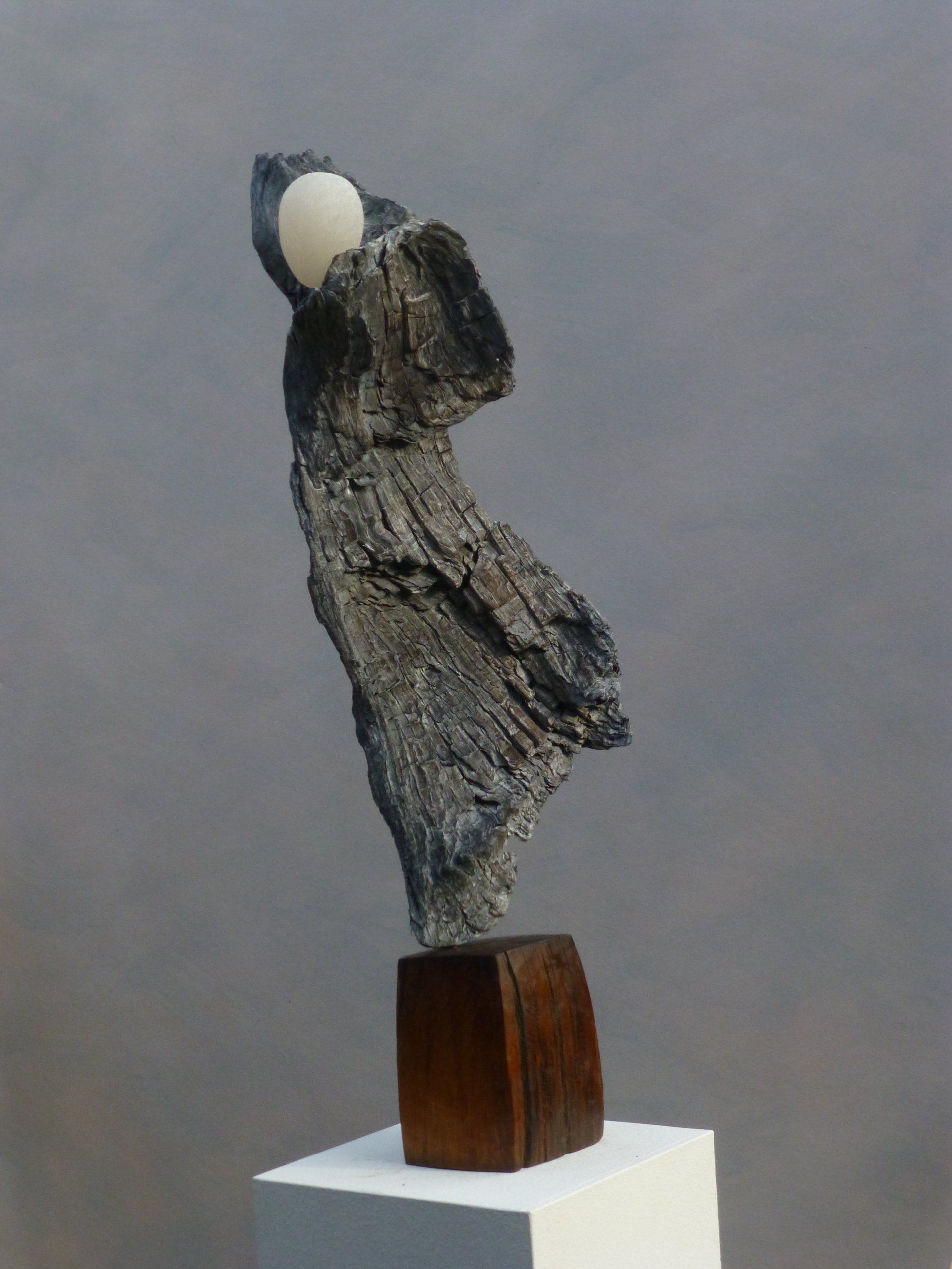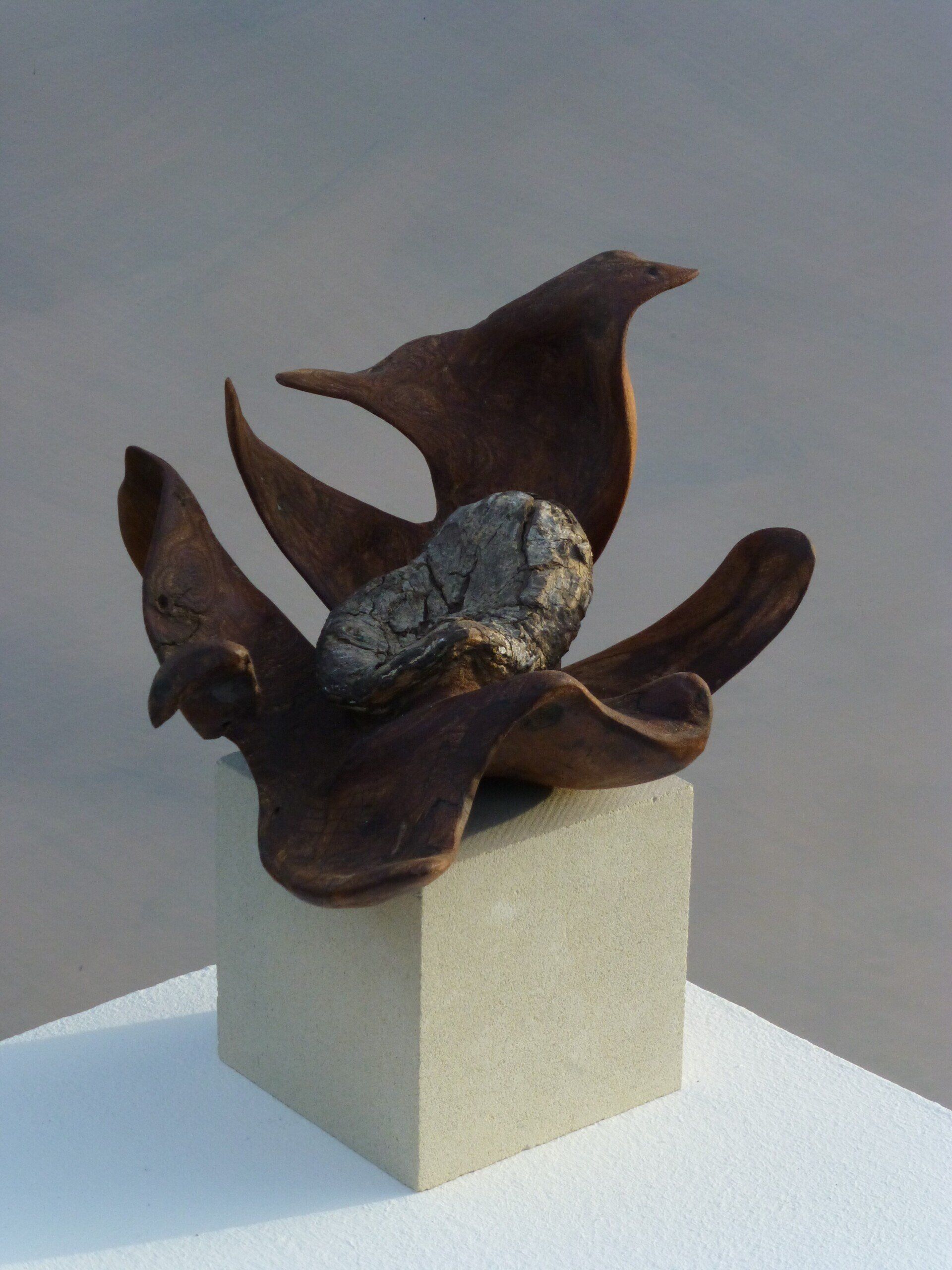 Das Ausgangsmaterial meiner Holzskulpturen ist vielfältiges Fundholz aus Raum und Zeit, wie mediterrane Pinien- und Olivenwurzeln, alte, schwarz gewordene Flusseiche aus der Elbe oder sogar 2000-jährige Mooreiche aus Ostfriesland.