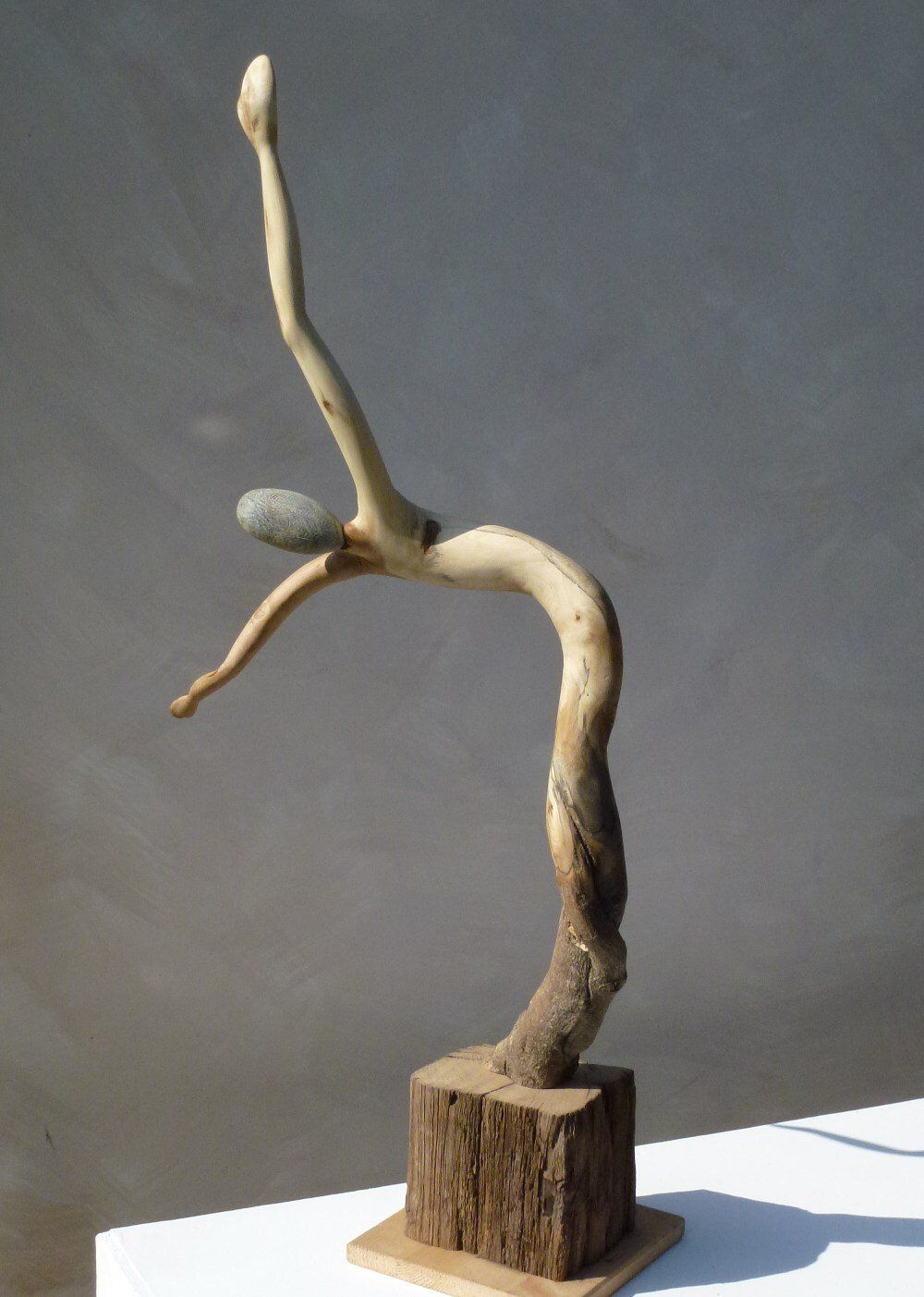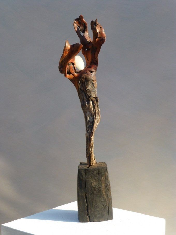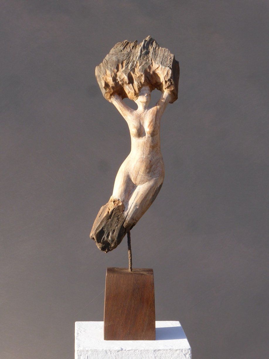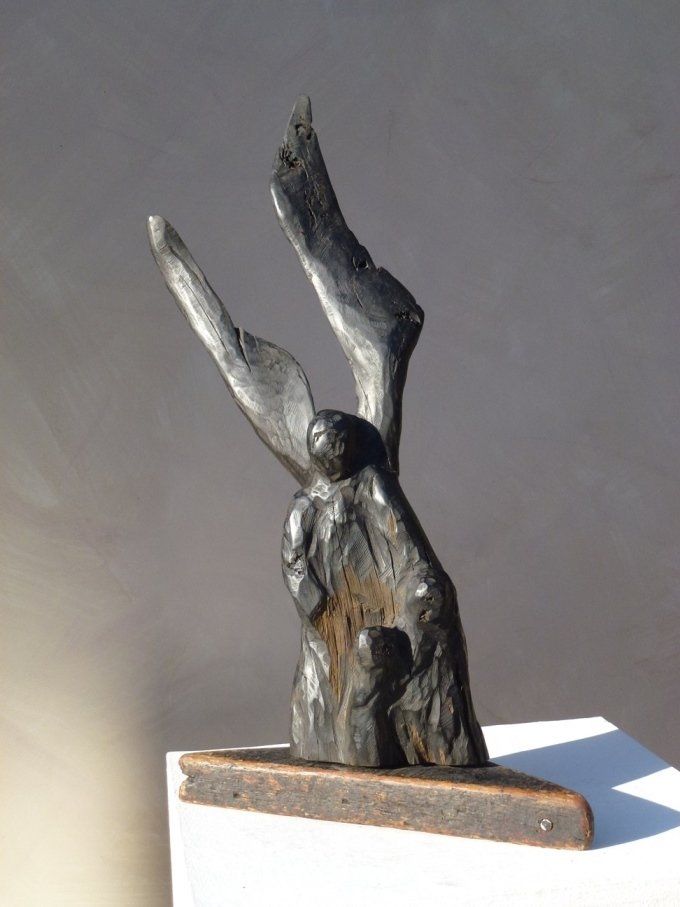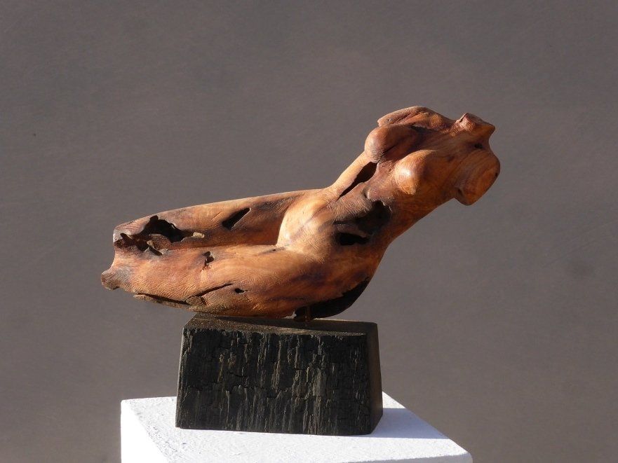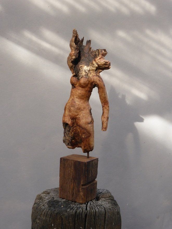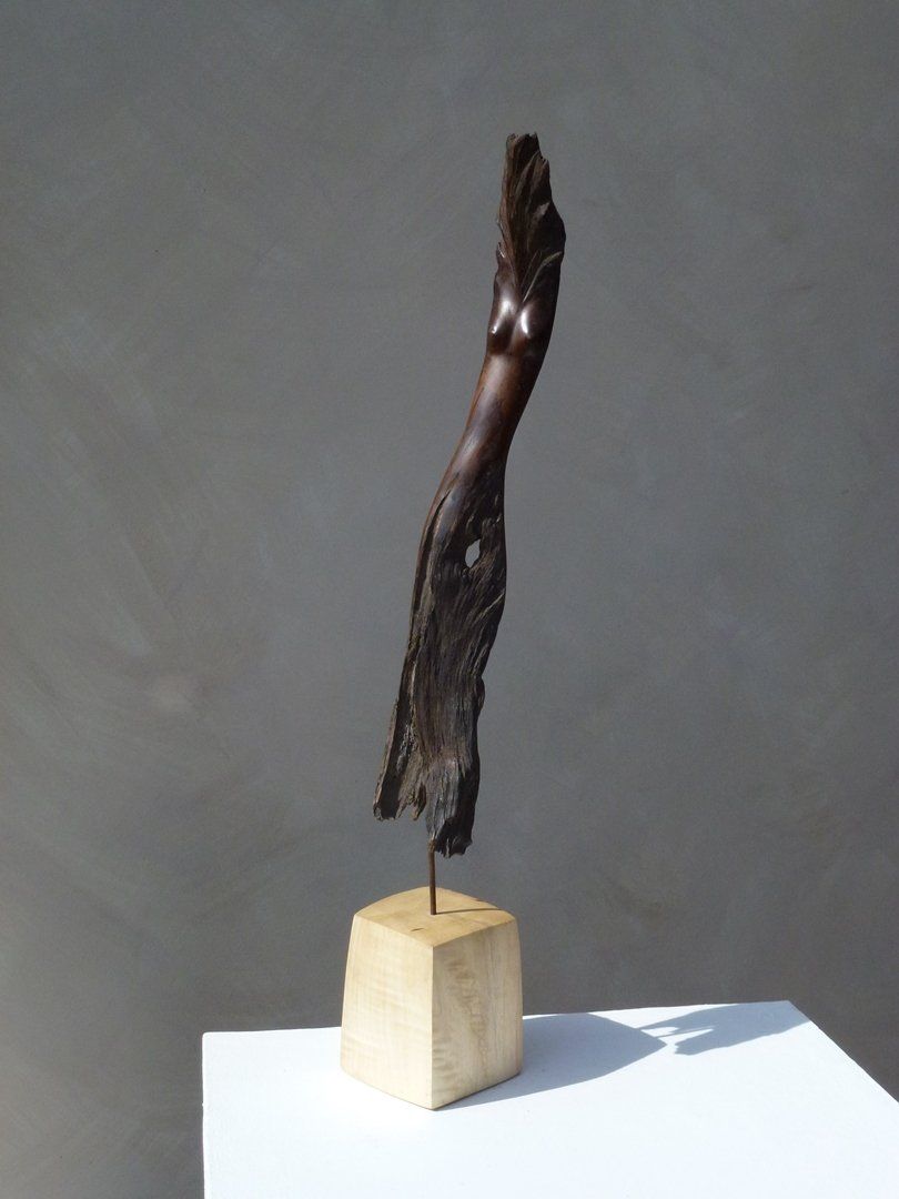 Das Ausgangsmaterial meiner Holzskulpturen ist vielfältiges Fundholz aus Raum und Zeit, wie mediterrane Pinien- und Olivenwurzeln, alte, schwarz gewordene Flusseiche aus der Elbe oder sogar 2000-jährige Mooreiche aus Ostfriesland.